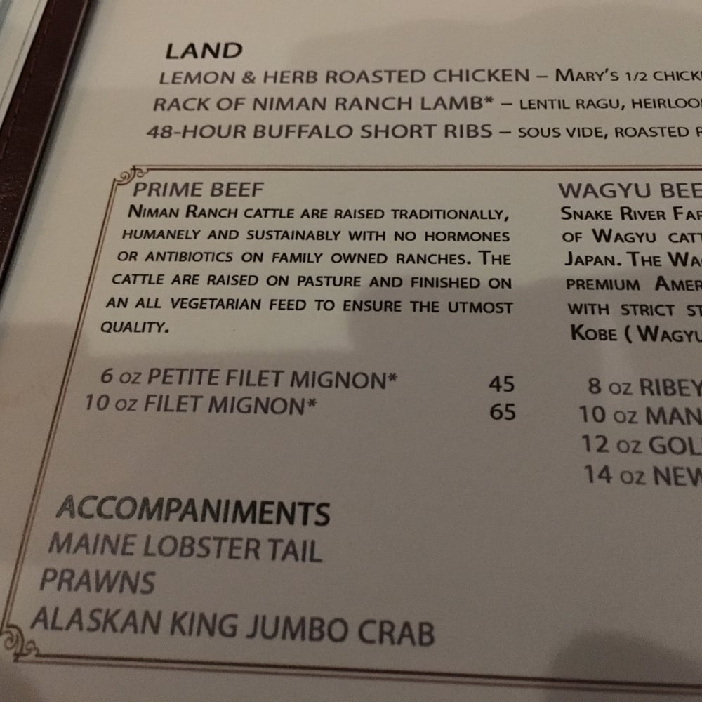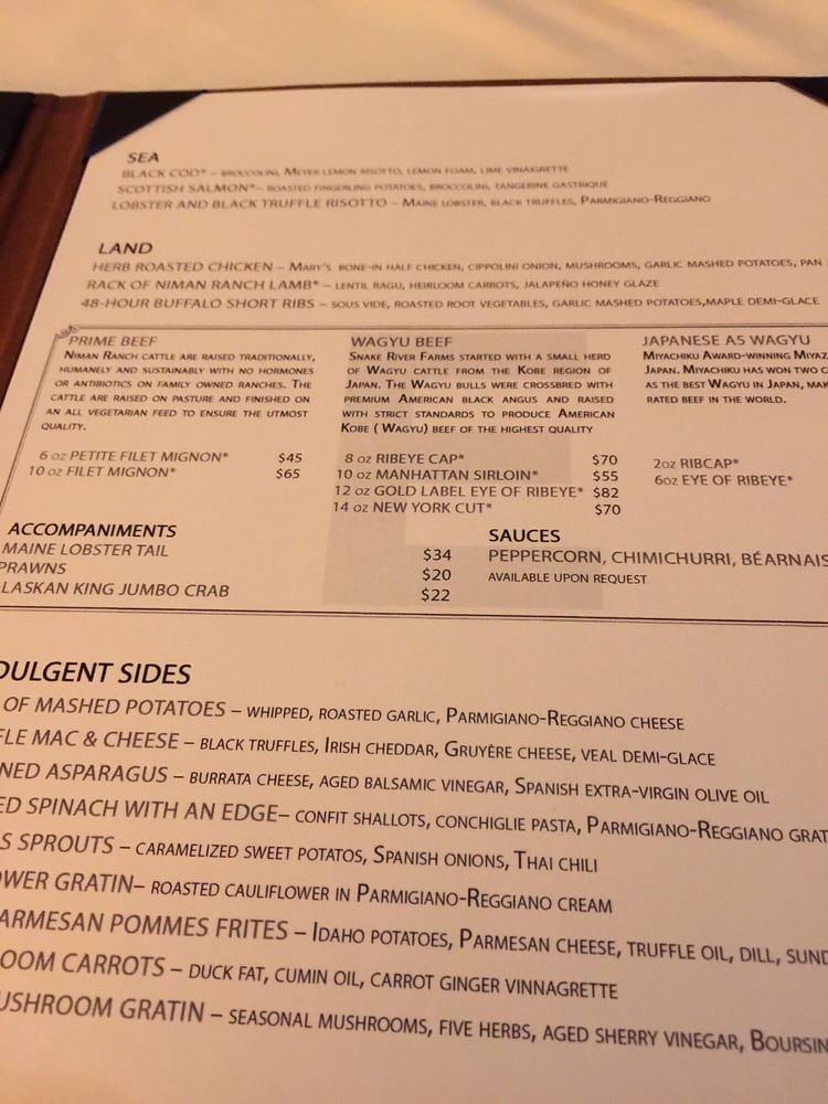 Parisian gnocchi, wild mushroom, heirloom carrot, Meyer lemon beurre Blanc. Consuming raw or undercooked meats, poultry, seafood, shellfish, or eggs may increase your risk of foodborne illness. Menu items may contain or come into contact with wheat, eggs, peanuts, tree nuts, fish, shellfish, soy, and milk.